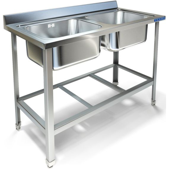 1400х700х850мм, Две цельнотянутые емкости размером 600х500х300 из нержавеющей стали марки AISI 304 толщиной 1мм, обнижение 2мм. Объемный пристенный борт высотой 70мм. Каркас сварной из уголка 40х40 нержавеющей стали марки AISI 430 толщиной 2мм, внизу по периметру обвязка. Ванна комплектуется выпуском с нержавеющей решеткой и механическим запорным клапаном, диаметр выпуска 90мм, диаметр подключаемого сифона 50мм, перелив, регулируемые опоры. На дно ванны нанесена виброшумоизоляция. Ванна поставляется в собранном виде.