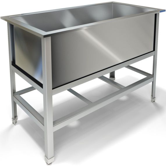 800х430х850мм, Одна емкость сварная размером 700х330х300 из нержавеющей стали марки AISI 304 толщиной 0,8мм. Каркас сварной из уголка 40х40 нержавеющей стали марки AISI 430 толщиной 2мм, внизу по периметру обвязка. Ванна комплектуется выпуском с нержавеющей решеткой и механическим запорным клапаном, диаметр выпуска 90мм, диаметр подключаемого сифона 50мм, регулируемые опоры. На дне ванны ребра (лучи) для жесткости и снижения вибрации. Ванна поставляется в собранном виде.