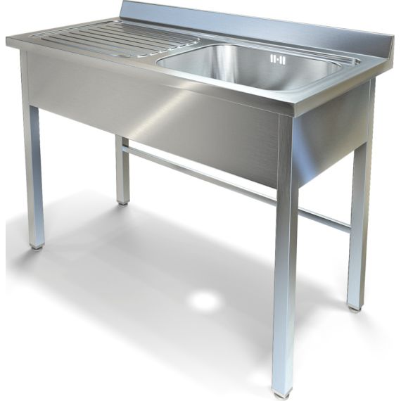 1200х600х850мм, Одна цельнотянутая емкость размером 500х400х250 из нержавеющей стали марки AISI 304 толщиной 1мм, ванна справа, обнижение 15мм, крыло рифленое с сушкой и наклоном для стекания воды с посуды в ванну. Объемный пристенный борт высотой 70мм. Фартук с 3-х сторон высотой 285 мм. Каркас сварной из трубы 40х40 нержавеющей стали марки AISI 430 толщиной 1,2мм, с тыловой части установлены две перемычки для жесткости. Ванна комплектуется выпуском с нержавеющей решеткой и механическим запорным клапаном, диаметр выпуска 90мм, диаметр подключаемого сифона 50мм, перелив, регулируемые опоры. На дно ванны нанесена виброшумоизоляция. Ванна поставляется в собранном виде.