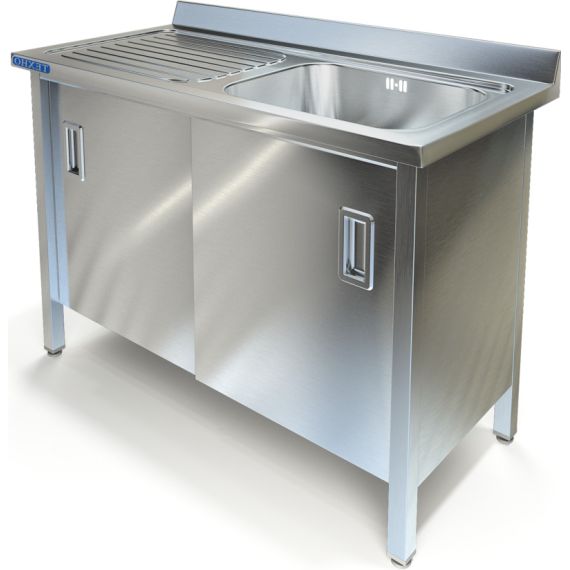 1200х600х850мм, Одна цельнотянутая емкость размером 500х400х250 из нержавеющей стали марки AISI 304 толщиной 1мм, ванна справа, обнижение 15мм, крыло рифленое с сушкой и наклоном для стекания воды с посуды в ванну. Объемный пристенный борт высотой 70мм. Корпус сварной из нержавеющей стали марки AISI 430 толщиной 0,8мм. Двери-купе, полка. Ванна комплектуется выпуском с нержавеющей решеткой и механическим запорным клапаном, диаметр выпуска 90мм, диаметр подключаемого сифона 50мм, перелив, регулируемые опоры. На дно ванны нанесена виброшумоизоляция. Ванна поставляется в собранном виде.