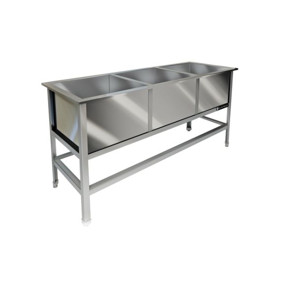 1150х430х850, ванна сварная из стали AISI 304 (3 емк.)330х330х300, обвязка, каркас разборный, уголок из оцинкованного металла, толщиной 1,5 мм, рабочая поверхность из стали AISI 304 , толщиной 0,8 мм
