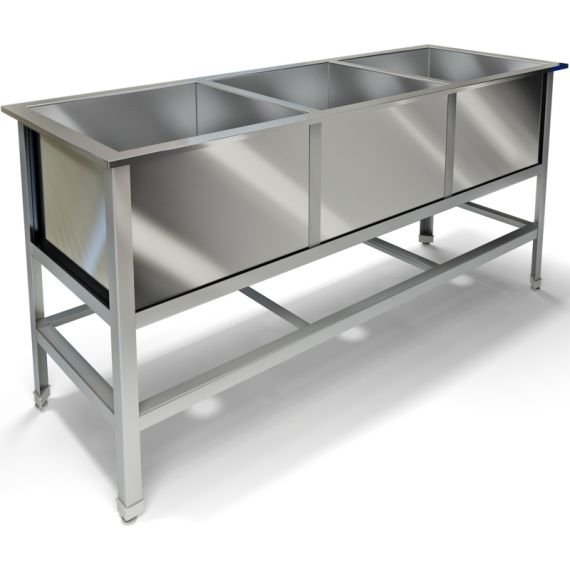 1150х430х850мм, Три сварные емкости размером 330х330х300 из нержавеющей стали марки AISI 304 толщиной 0,8мм, крыло. Каркас сварной из уголка 40х40 толщиной 2мм, покрытого порошковой краской серого цвета, внизу по периметру обвязка. Ванна комплектуется выпуском с нержавеющей решеткой и механическим запорным клапаном, диаметр выпуска 90мм, диаметр подключаемого сифона 50мм, регулируемые опоры. На дне ванны ребра (лучи) для жесткости и снижения вибрации. Ванна поставляется в собранном виде.