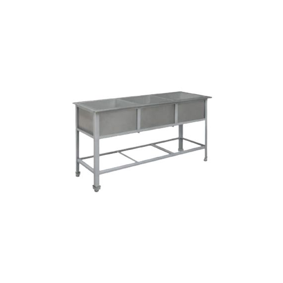 1750х600х850мм, Три сварные емкости размером 530х500х400 из нержавеющей стали марки AISI 304 толщиной 0,8мм, крыло. Каркас сварной из уголка 40х40 толщиной 2мм, покрытого порошковой краской серого цвета, внизу по периметру обвязка. Ванна комплектуется выпуском с нержавеющей решеткой и механическим запорным клапаном, диаметр выпуска 90мм, диаметр подключаемого сифона 50мм, регулируемые опоры. На дне ванны ребра (лучи) для жесткости и снижения вибрации. Ванна поставляется в собранном виде.