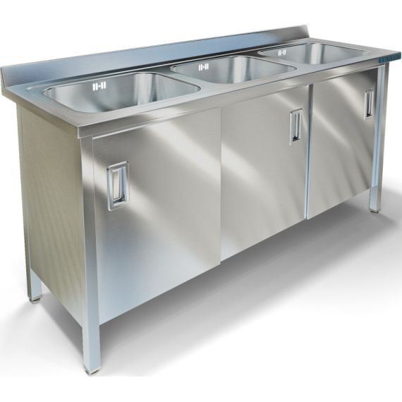 1800х700х850мм, Три цельнотянутые емкости размером 500х500х300 из нержавеющей стали марки AISI 304 толщиной 1мм, обнижение 15 мм. Объемный пристенный борт высотой 70мм. Фартук с 3-х сторон высотой 285 мм. Корпус сварной из нержавеюшей стали марки AISI 430 толщиной 0,8мм. Двери-купе, полка. Ванна комплектуется выпуском с нержавеющей решеткой и механическим запорным клапаном, диаметр выпуска 90мм, диаметр подключаемого сифона 50мм, перелив, регулируемые опоры. На дно ванны нанесена виброшумоизоляция. Ванна поставляется в собранном виде.
