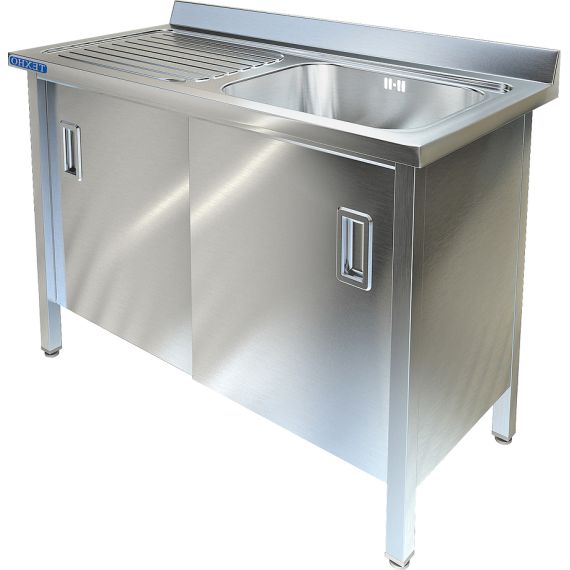 1200х600х850мм, Одна цельнотянутая емкость размером 500х400х250 из нержавеющей стали марки AISI 304 толщиной 1мм, ванна справа, обнижение 15мм, крыло рифленое с сушкой и наклоном для стекания воды с посуды в ванну. Объемный пристенный борт высотой 70мм. Корпус сварной из нержавеющей стали марки AISI 304 толщиной 0,8мм. Двери-купе, полка. Ванна комплектуется выпуском с нержавеющей решеткой и механическим запорным клапаном, диаметр выпуска 90мм, диаметр подключаемого сифона 50мм, перелив, регулируемые опоры. На дно ванны нанесена виброшумоизоляция. Ванна поставляется в собранном виде.