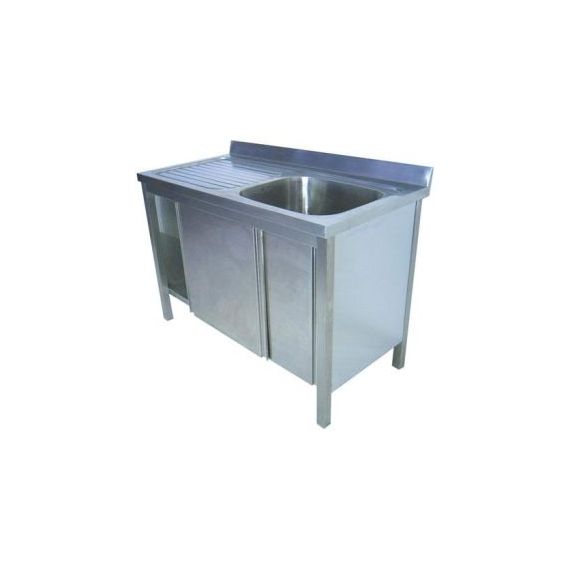 1200х700х850мм, Одна цельнотянутая емкость размером 500х500х300 из нержавеющей стали марки AISI 304 толщиной 1мм, ванна справа, обнижение 15мм, крыло рифленое с сушкой и наклоном для стекания воды с посуды в ванну. Объемный пристенный борт высотой 70мм. Корпус сварной из нержавеющей стали марки AISI 304 толщиной 0,8мм. Двери-купе, полка. Ванна комплектуется выпуском с нержавеющей решеткой и механическим запорным клапаном, диаметр выпуска 90мм, диаметр подключаемого сифона 50мм, перелив, регулируемые опоры. На дно ванны нанесена виброшумоизоляция. Ванна поставляется в собранном виде.