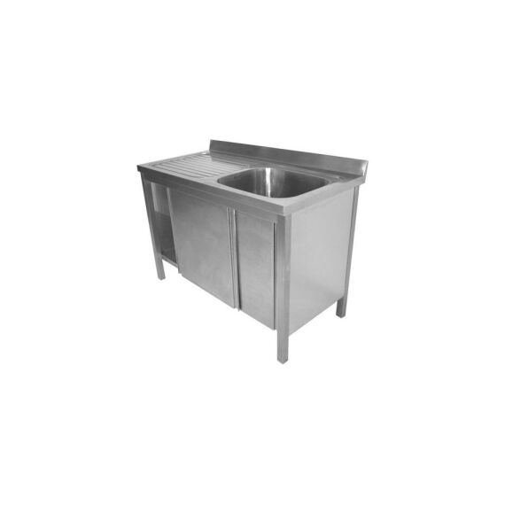1400х700х850мм, Одна цельнотянутая емкость размером 600х500х300 из нержавеющей стали марки AISI 304 толщиной 1мм, ванна справа, обнижение 2мм, крыло плоское. Объемный пристенный борт высотой 70мм. Корпус сварной из нержавеющей стали марки AISI 304 толщиной 0,8мм. Двери-купе, полка. Ванна комплектуется выпуском с нержавеющей решеткой и механическим запорным клапаном, диаметр выпуска 90мм, диаметр подключаемого сифона 50мм, перелив, регулируемые опоры. На дно ванны нанесена виброшумоизоляция. Ванна поставляется в собранном виде.