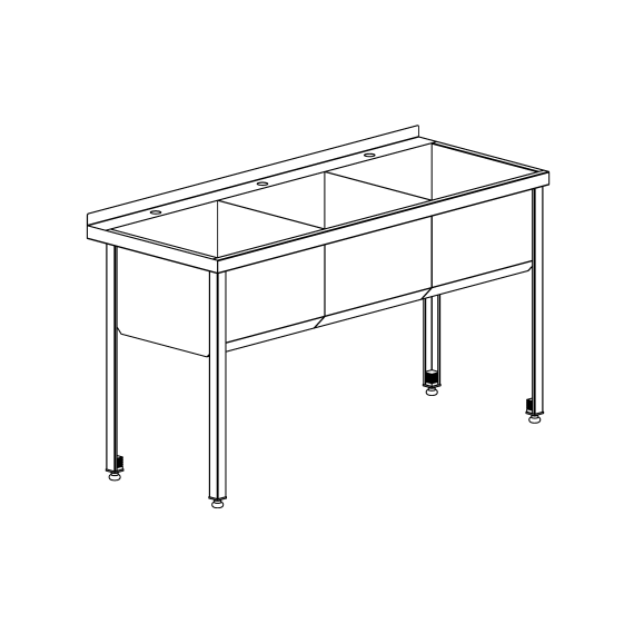 Ванна моечная с бортом трёхсекционная. Емкость ванны сварная, выполненная из нержавеющей стали марки AISI 304, толщиной 0,8 мм. Имеет скошенное дно для удобства санитарной обработки. Размер секции - 600х600х400 мм. Имеет задний борт с отверстием под смеситель ф35 мм. Имеется отверстие для слива ф52 мм. Ножки съемные из оцинкованной стали толщиной 1,5 мм, с регулируемыми по высоте опорами. Смеситель и слив в комплект не входят.