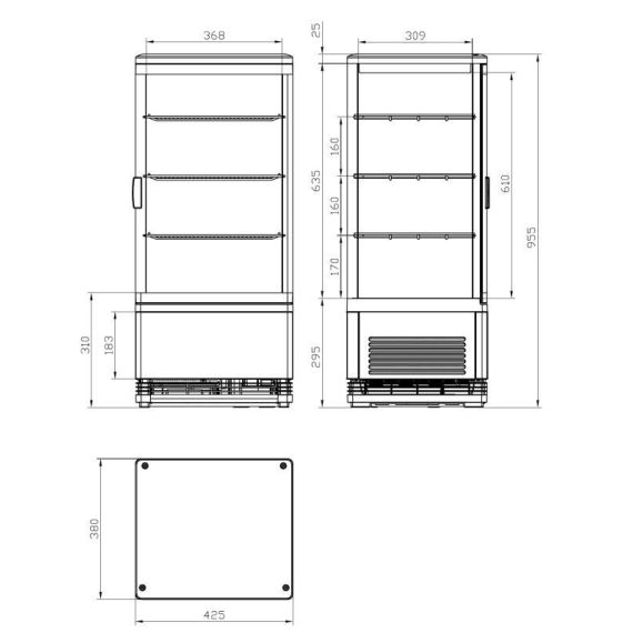 426х386х988мм, 220В, 0,17кВт, 78л, 0/+12°С, LED-подсветка 6500K сверху, запирается на ключ; 3 полки - 365х307мм; макс. нагрузка на полку 10 кг, R600a, 40г