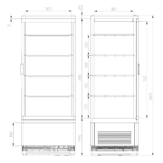 426x386x1138мм, 220В; 0,19кВт, 98л; 0/+12; LED-подсветка 6500K по 2ум стойкам, запирается на ключ; 4 полки - 365х307мм; макс. нагрузка на полку 10 кг, R600а, 40 г