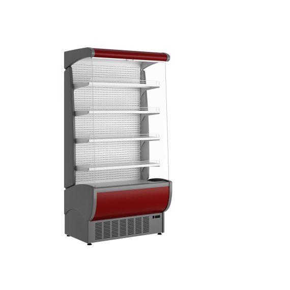 991х697х2070, t режим +1…+10 C. Витрина холодильная,со встроенным агрегатом, гнутое стекло, 4 металлических полки, полезный объемвыкладки— 0,51 м3,охлаждаемая площадь поддонов для выкладки продуктов 1,84 м2, динамическое охлаждение, оттайка ТЭН, потр. эл.энергии в сутки —13 кВт, R404A, цвет корпуса —белый, фриз и щиток — красный, 14,4Вт, 220В.