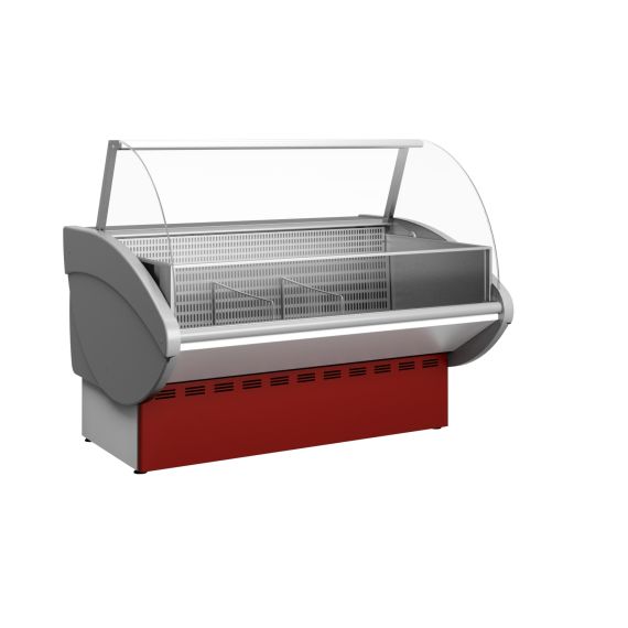 1500х1100х1230, t режим -18 C. Витрина холодильная, (-18C),со встроенным агрегатом, гнутое стекло, 1 стеклянная полка, полезный объем — 0,16м3,охлаждаемая площадь поддонов для выкладки продуктов, 1,1 м2, статическое охлаждение, раздвижные задние шторки, оттайка ТЭН, потр. эл.энергии в сутки —13,5кВт, 180кг, цвет корпуса — серый, экспозиционные поверхности — отделка под серебро, 30Вт, 220В, щиток в комплект не входит.