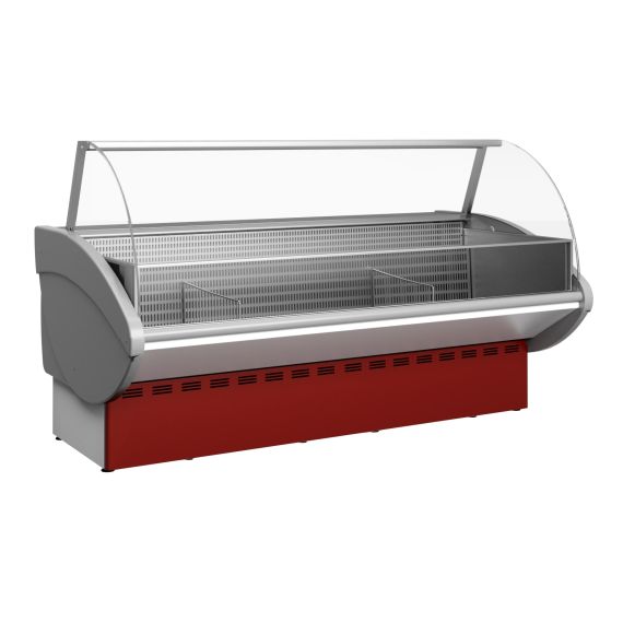 2100х1100х1230, t режим -18 C. Витрина холодильная, (-18C),со встроенным агрегатом, гнутое стекло, 1 стеклянная полка, полезный объем — 0,22м3,охлаждаемая площадь поддонов для выкладки продуктов, 1,58 м2, статическое охлаждение, раздвижные задние шторки, оттайка ТЭН, потр. эл.энергии в сутки —20, 5кВт, 230кг, цвет корпуса — серый, экспозиционные поверхности — отделка под серебро, 30Вт, 220В, щиток в комплект не входит.
