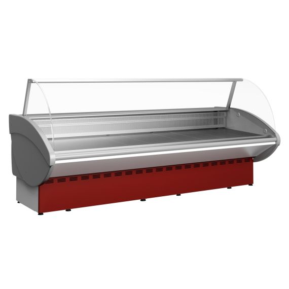 2700х1100х1230, t режим 0…+7 C. Витрина холодильная, (0…+7C),со встроенным агрегатом, гнутое стекло, 1 стеклянная полка, полезный объем — 0,64м3,охлаждаемая площадь поддонов для выкладки продуктов, 2,05 м2, динамическое охлаждение, раздвижные задние шторки, оттайка естеств. теплопритоками, потр. эл.энергии в сутки —16кВт, 225кг,, цвет корпуса — серый, экспозиционные поверхности — отделка под серебро, 64Вт, 220В, щиток в комплект не входит.