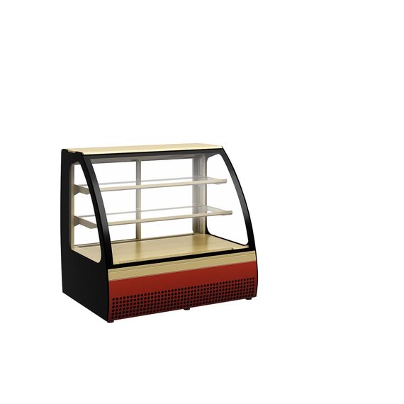 950х730х875 t режим +1…+10 C. Витрина холодильная,со встроенным агрегатом, гнутое стекло, 2 стеклянные полки, полезный объем —0,18 м3,охлаждаемая площадь поддонов для выкладки продуктов, 0,95 м2, динамическое охлаждение, раздвижные задние шторки, оттайка ТЭН, потр. эл.энергии в сутки —3,1 кВт, цвет корпуса — черный, экспозиционные поверхности — отделка под золото, 14,4Вт, 220В.
