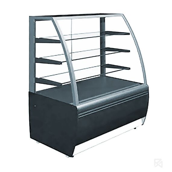 1300х700х1280, t режим …0+7 С. Витрина кондитерская, (0…+7С),со встроенным агрегатом, гнутое стекло, стеклопакет, 3 стеклянные полки с подсветкой LED свет тепло-белый, полезный объем — 0,28м3, размер выкладки - 1236*460, 3 полки: 1230*350, экспозиционная охлаждаемая площадь — 1,86м2, вентилируемое охлаждение, раздвижные задние шторки, автоматическая оттайка/ТЭНы, выпариватель, потр. эл.энергии в сутки — 8кВтч/сутки, 200кг, R134а, цвет корпуса — серо-черный, 220В, 0,7кВт