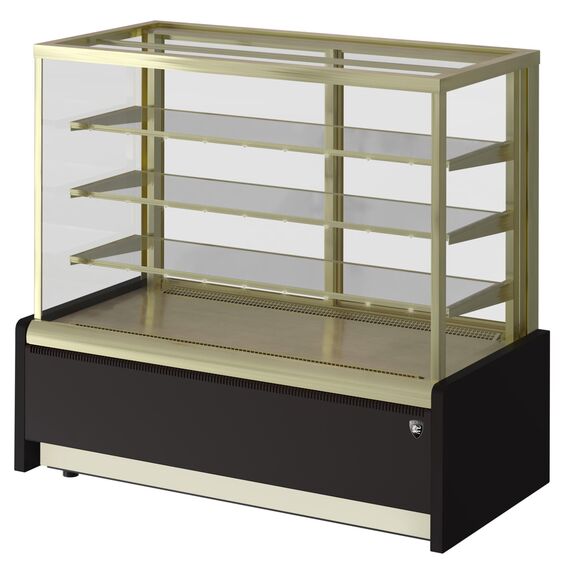 920х650х1265, t режим +6+12 С .Витрина кондитерская, (+6…+12С),со встроенным агрегатом, прямое стекло, 3 стеклянные полки с подсветкой LED тепло-белый, полезный объем — 0,18м3, размер выкладки - 860*440, 3 полки: 860*350мм, экспозиционная охлаждаемая площадь — 1,22м2, вентилируемое охлаждение, раздвижные задние шторки, автоматическая оттайка/ТЭНы, потр. эл.энергии в сутки — 5,2кВтч/сутки, 90кг, R134а, цвет корпуса — коричневый, экспозиционные поверхности — отделка под золото, 220В, 0,52кВт