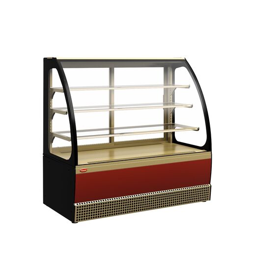 1305х740х1265мм, Витрина неохлаждаемая, 3 стеклянных полки, полезный объем —0,35 м3, неохлаждаемое, раздвижные задние шторки, цвет корпуса —черный, экспозиционные поверхности — отделка под золото 14,4Вт, 220В.