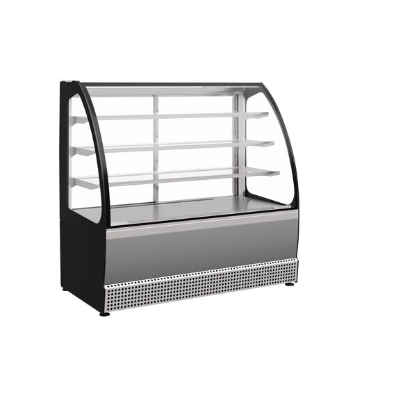 1305?740?1265 Витрина неохлаждаема, 3 стеклянных полки, полезный объем —0,35 м3, неохлаждаемое, раздвижные задние шторки, цвет корпуса —черный, экспозиционные поверхности — отделка под серебро 14,4Вт, 220В.
