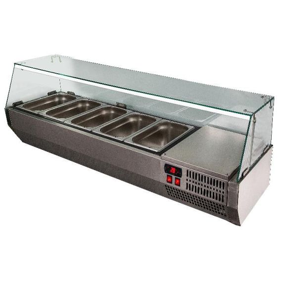 900х340х420мм,рабочий диапазон температур +2…+10 С, работают при температуре окр. Среды до +32 С, Хладагент R134a, витрина со стеклянным защитным колпаком с LED подсветкой, нижнее расположение агрегата, рассчитана на гастроемкости (3хGN1/4 и 1хGN1/2)