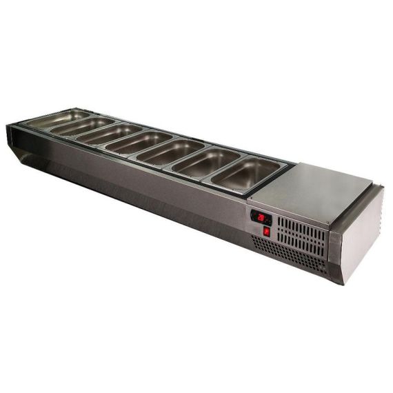 1375х340х220мм,рабочий диапазон температур +2…+10 С, работают при температуре окр. Среды до +32 С, Хладагент R134a, витрина открытого типа, нижнее расположение агрегата, рассчитана на гастроемкости GN1/4