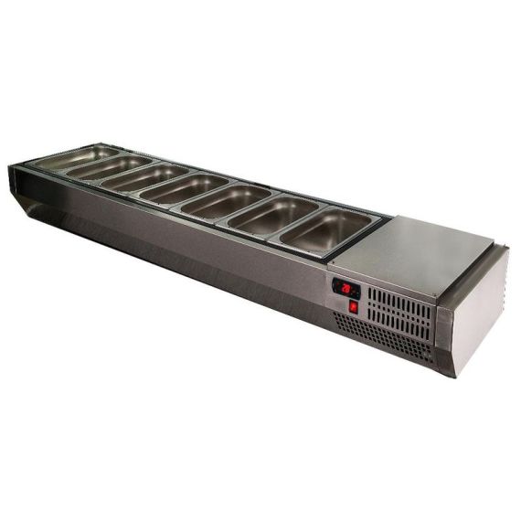 1850х340х220мм,рабочий диапазон температур +2…+10 С, работают при температуре окр. Среды до +32 С, Хладагент R134a, витрина открытого типа, нижнее расположение агрегата, рассчитана на гастроемкости GN1/4