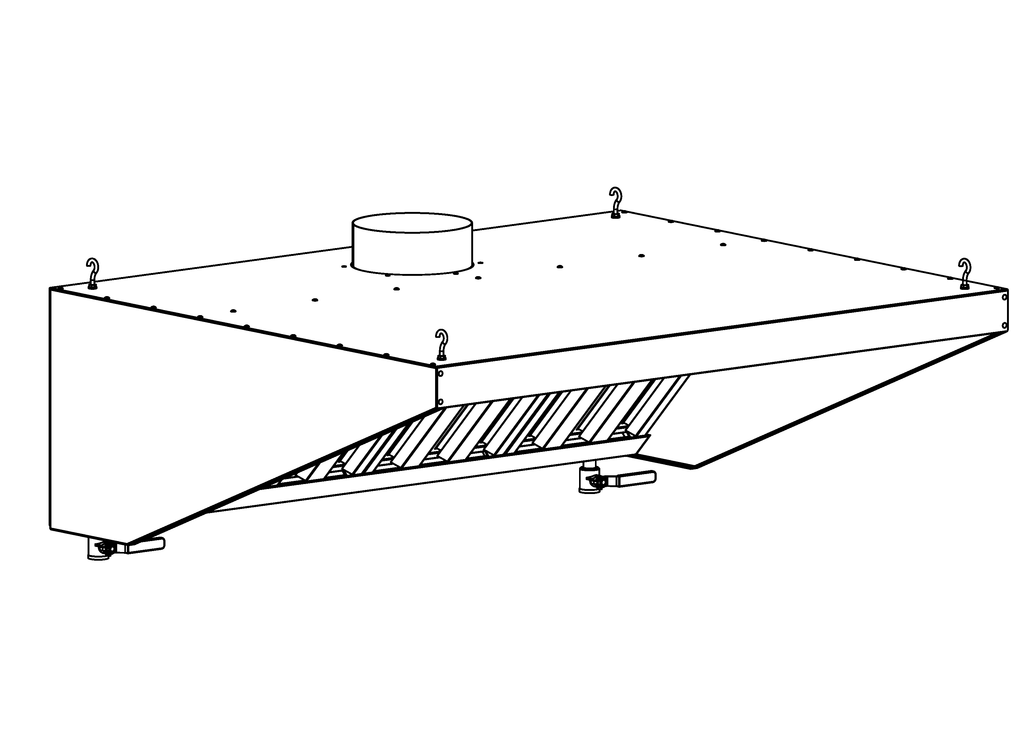 Зонт вытяжной имеет неразборную конструкцию. Исполнение пристенное. Обшивка зонта и кассеты фильтра из нерж. стали, задняя стенка из оцинкованной стали, фильтр-лабиринтный, диаметр отверстия (патрубка) 195 мм. Для монтажа вытяжки имеются крючки для крепления зонта. В комплект так же входят 2 сливных крана для слива скопившегося жира.