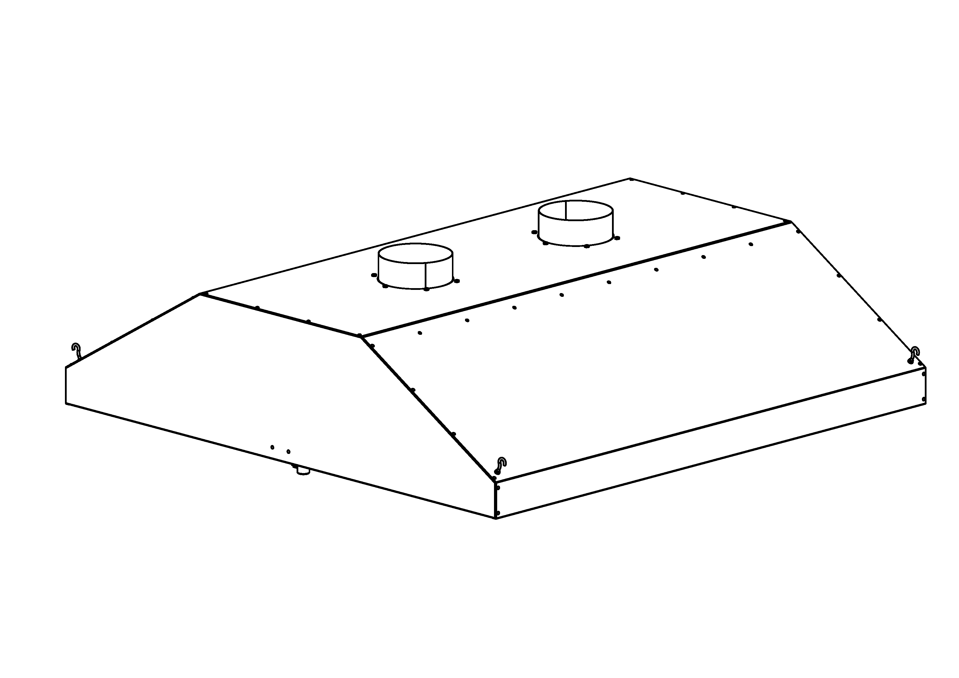 Зонт вытяжной имеет неразборную конструкцию. Исполнение островное. Все детали зонта выполнены из нерж. стали марки AISI 430 толщиной 0,8 мм. Зонт имеет съемные жироулавливающие фильтры (кассеты), 2 фланца диаметром 195 мм. Для монтажа вытяжки имеются крючки для крепления зонта. В комплект так же входят 2 сливных крана для слива скопившегося жира.